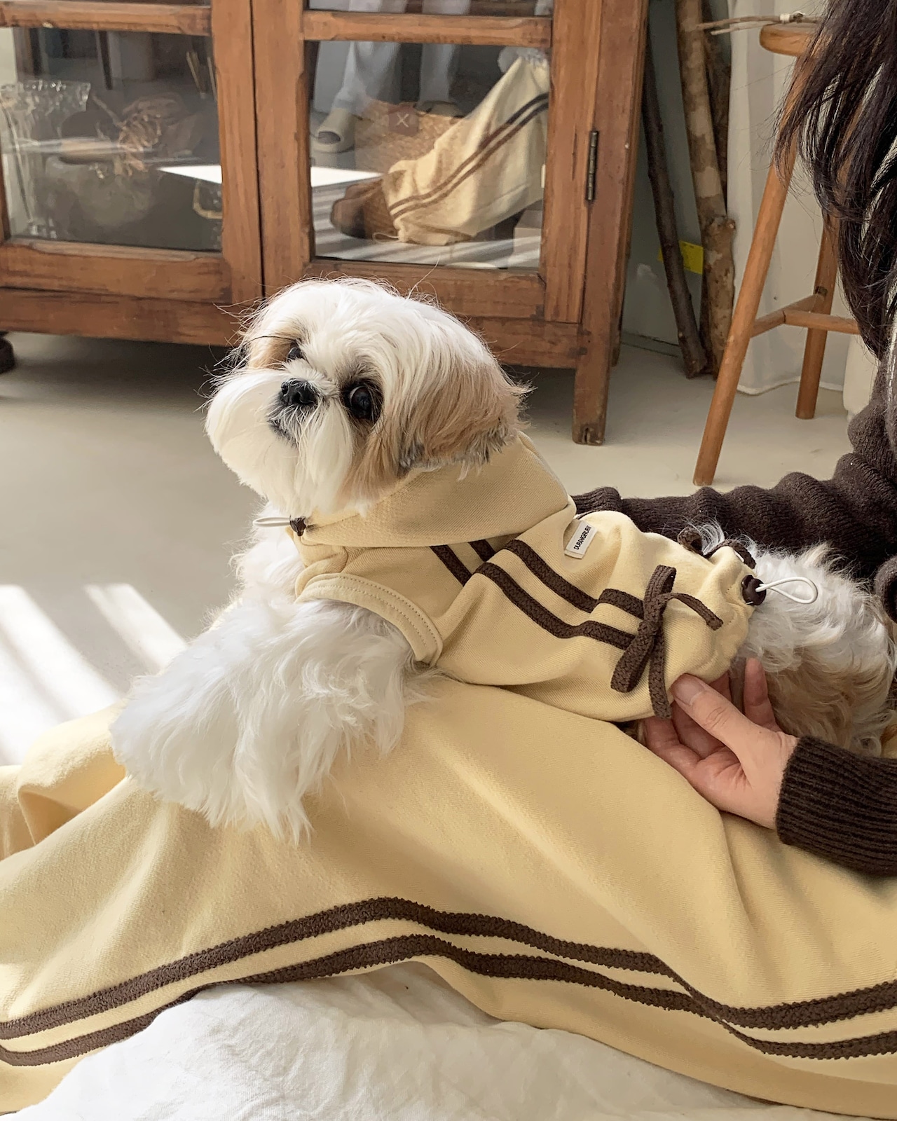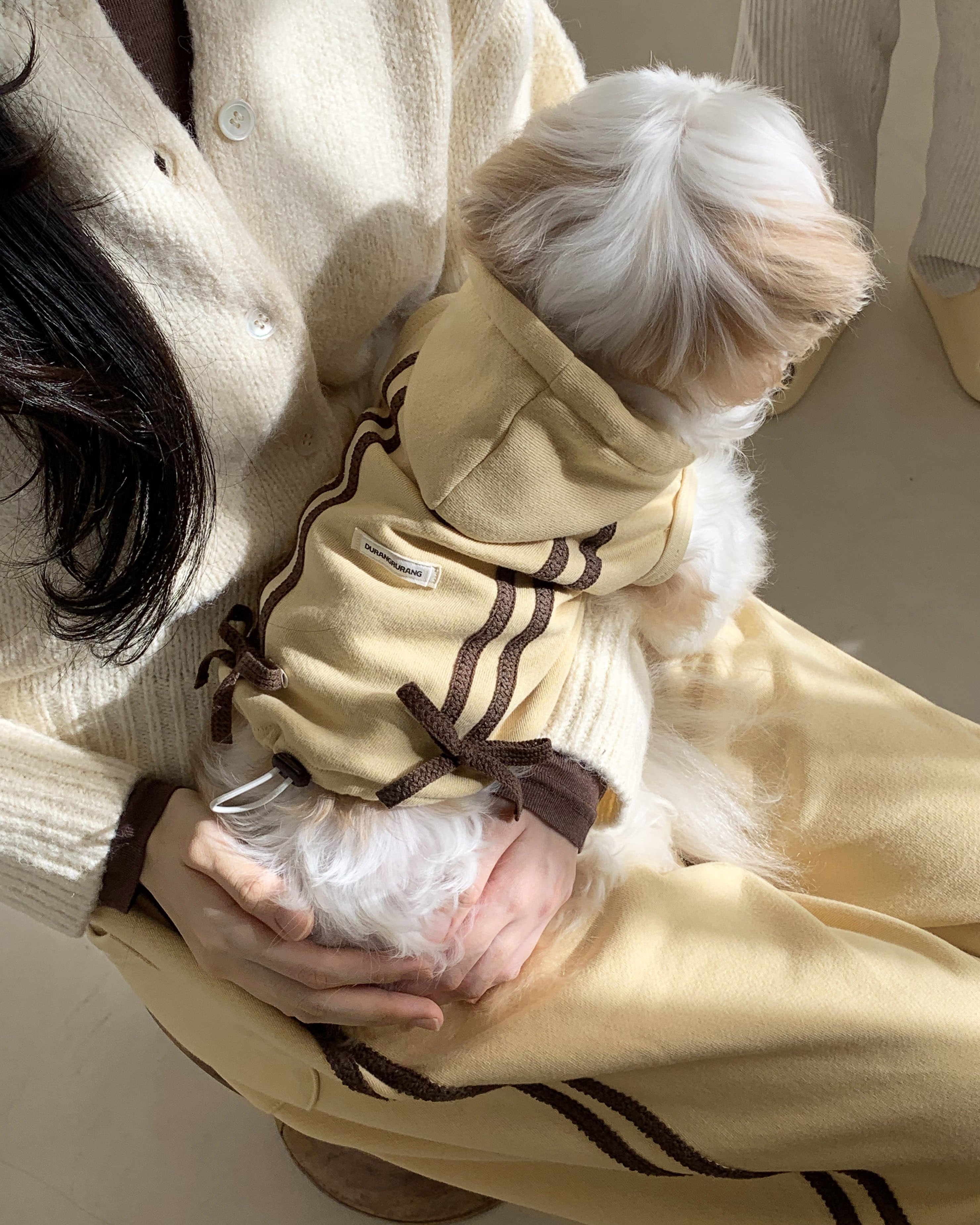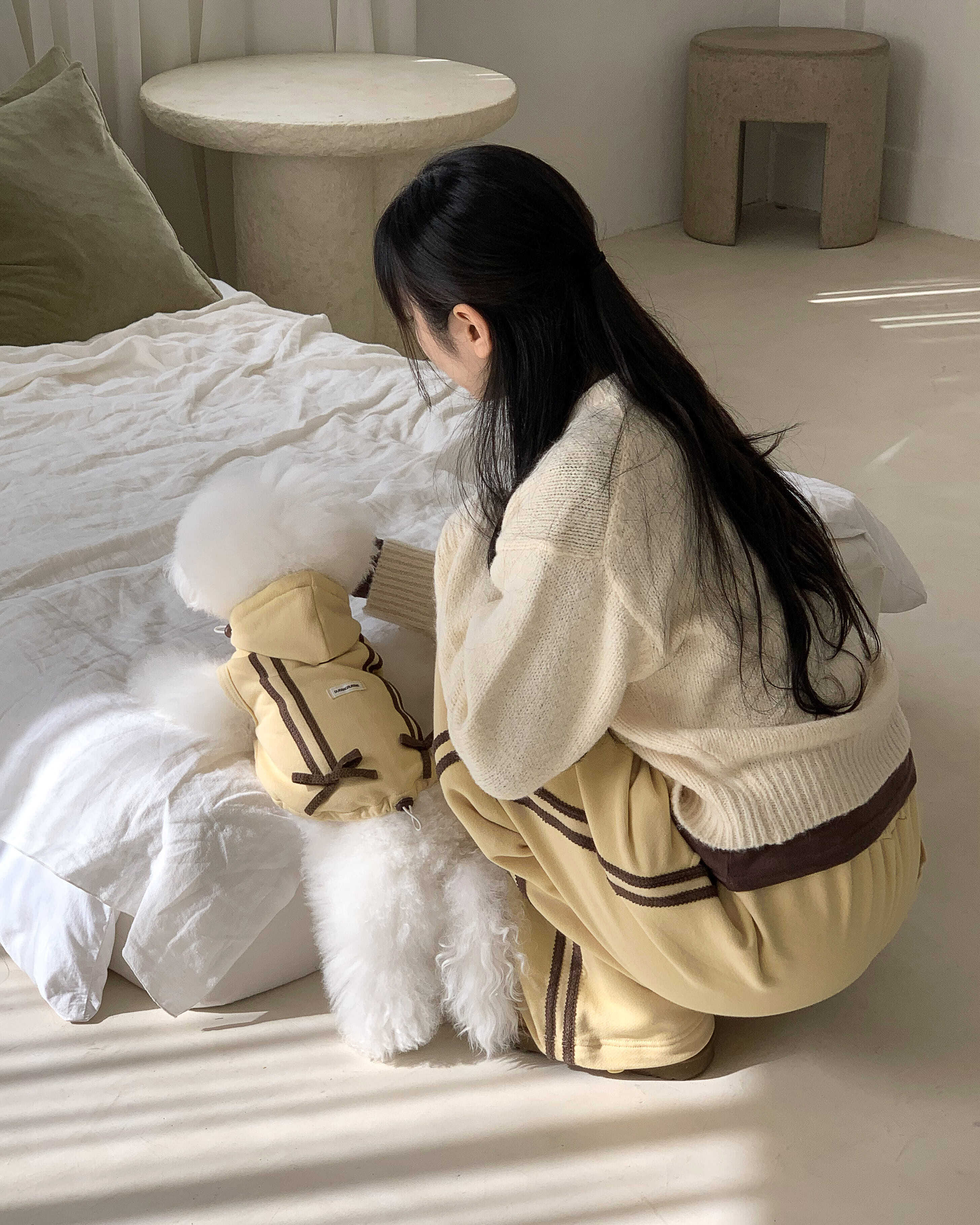 一緒に発売される、飼い主さま用のリボントラックジョガーパンツを合わせて