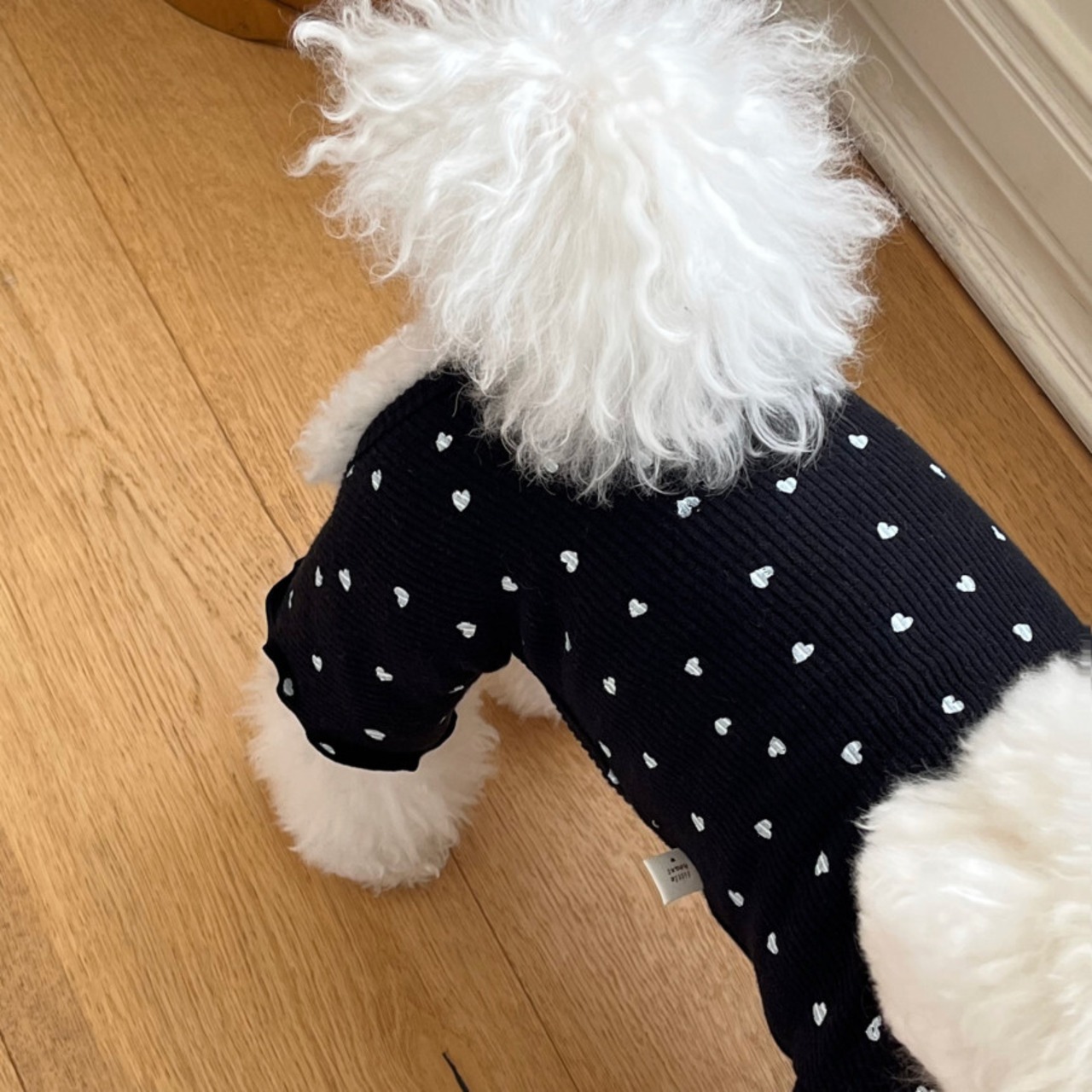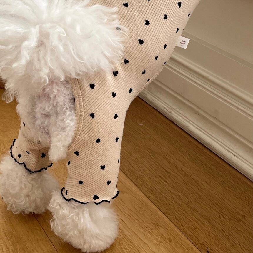 可愛いハート柄の生地にラベルで個性を出したオールインワン。