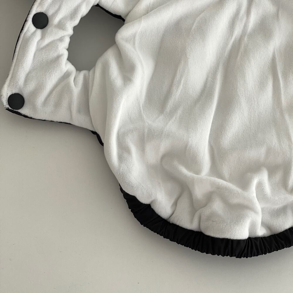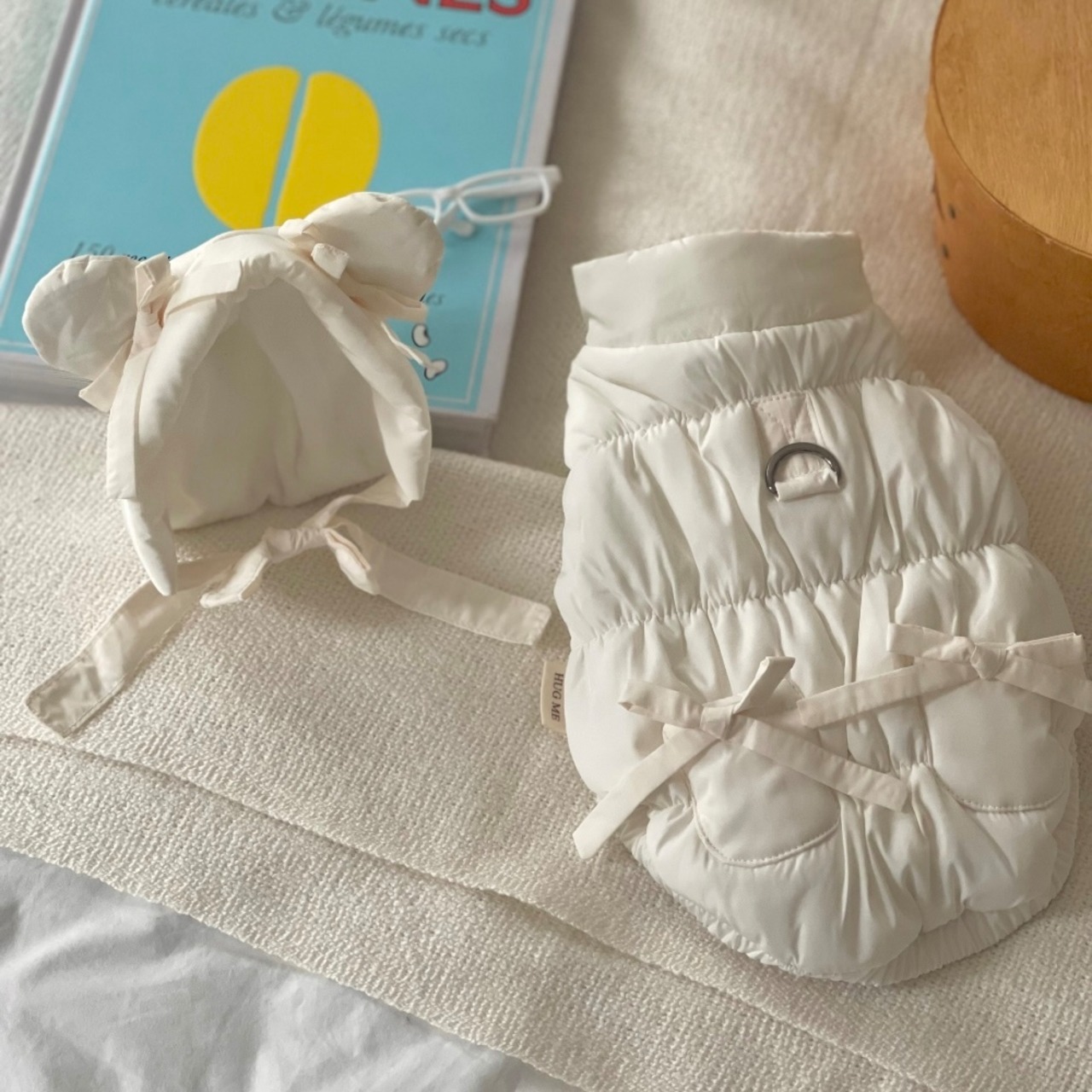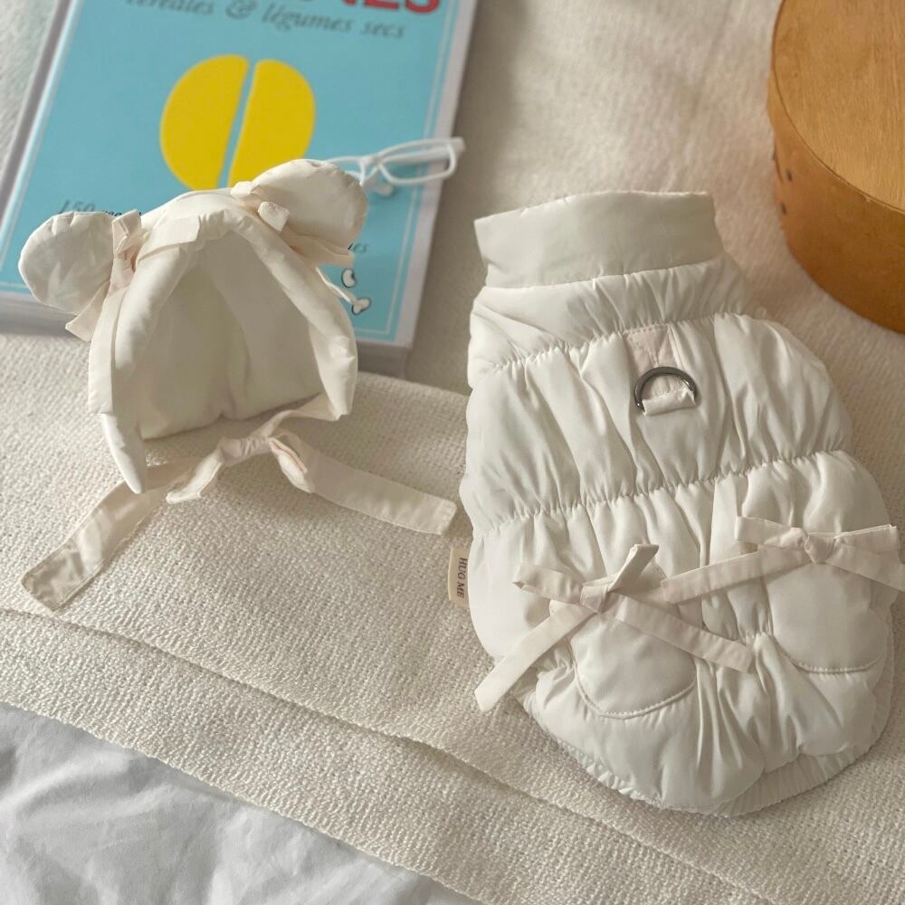 くま耳帽子がセットになった暖かいダウンベスト。