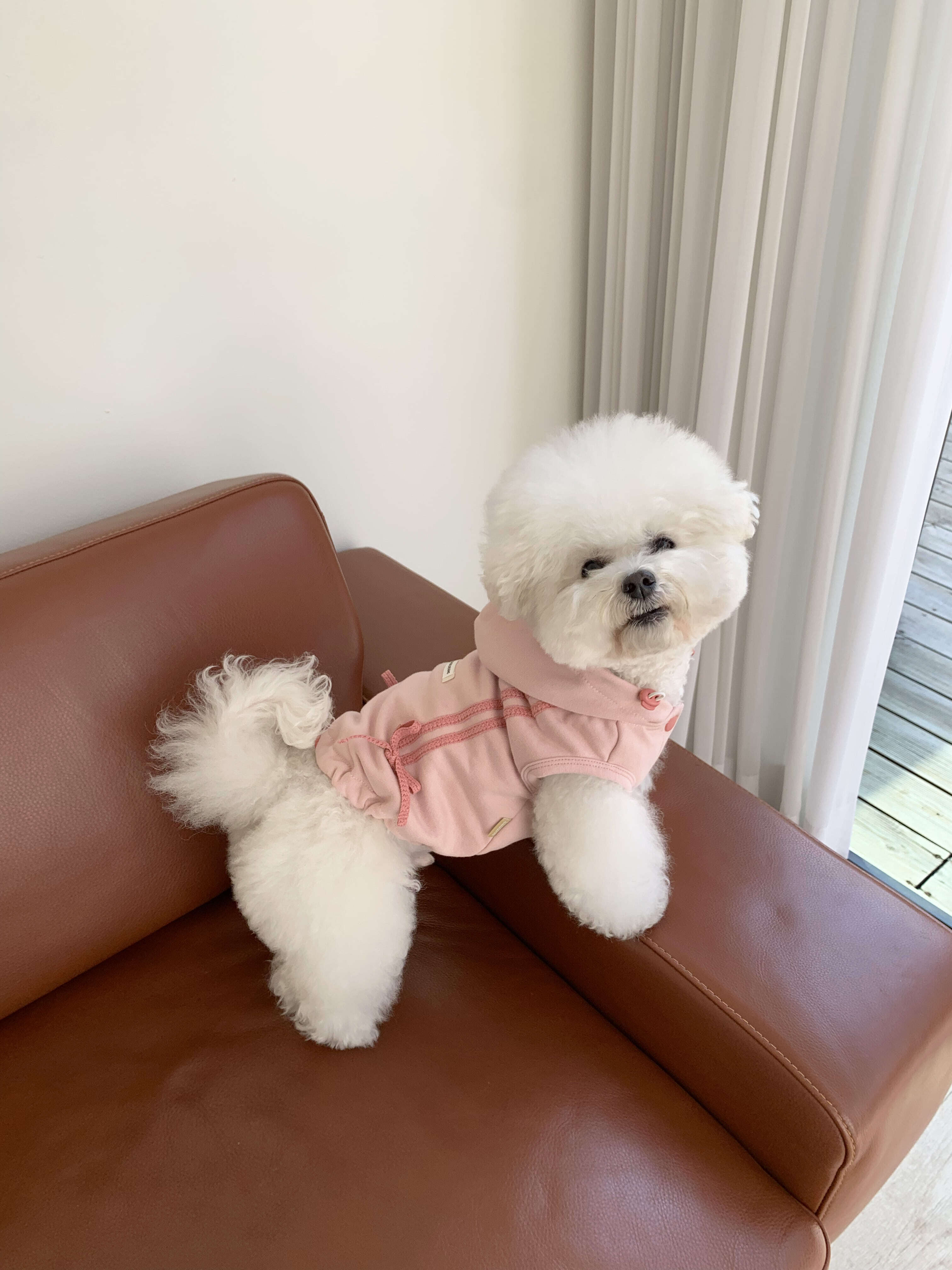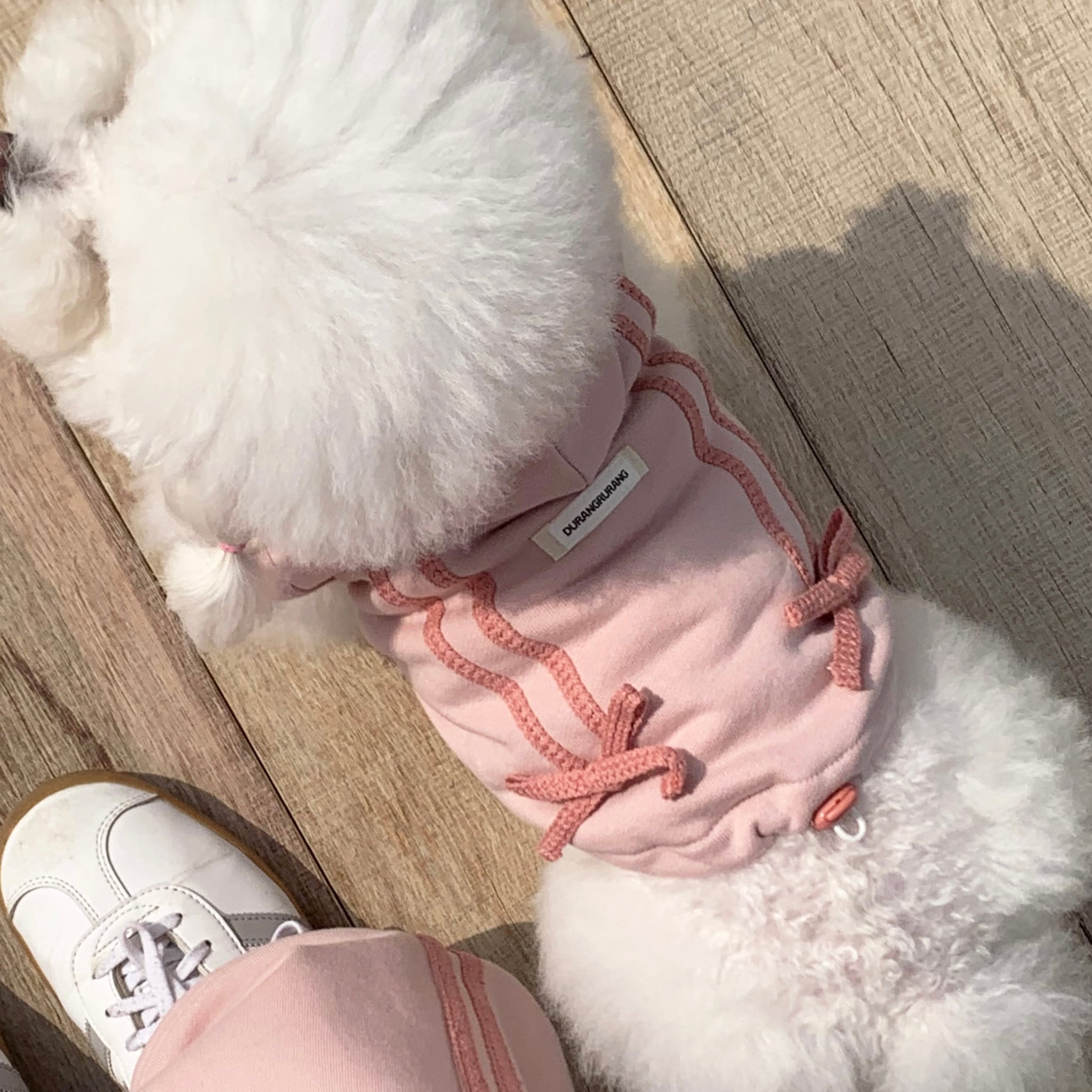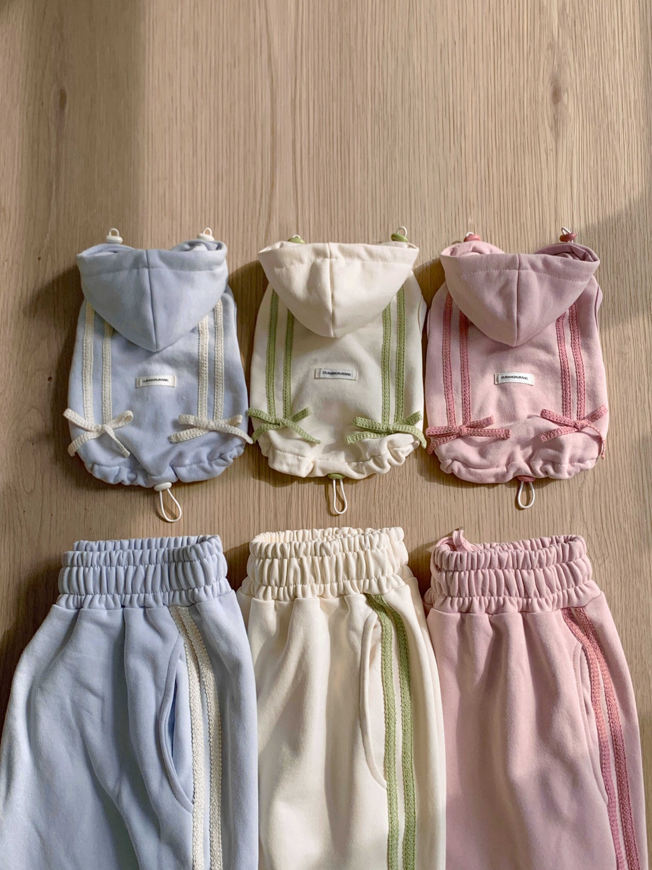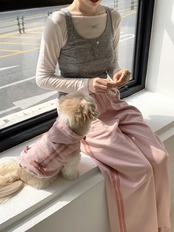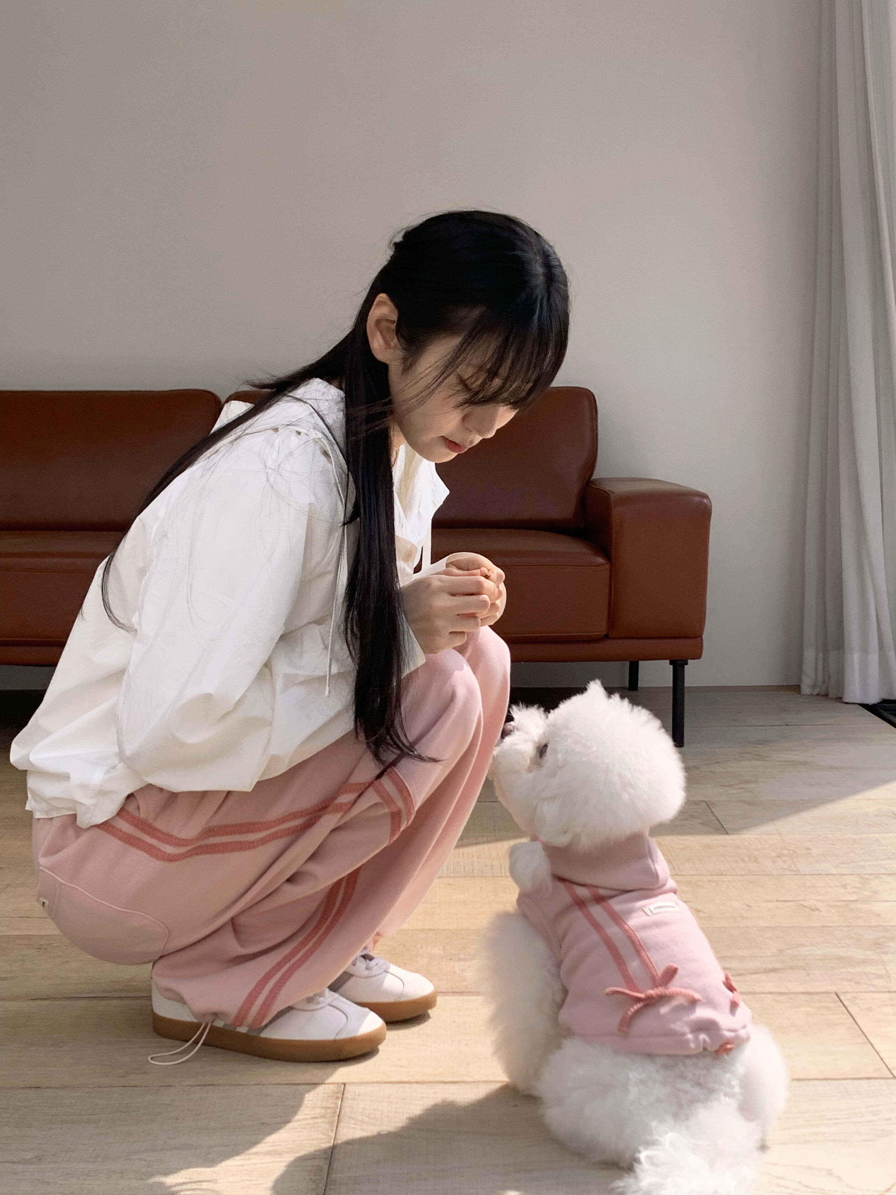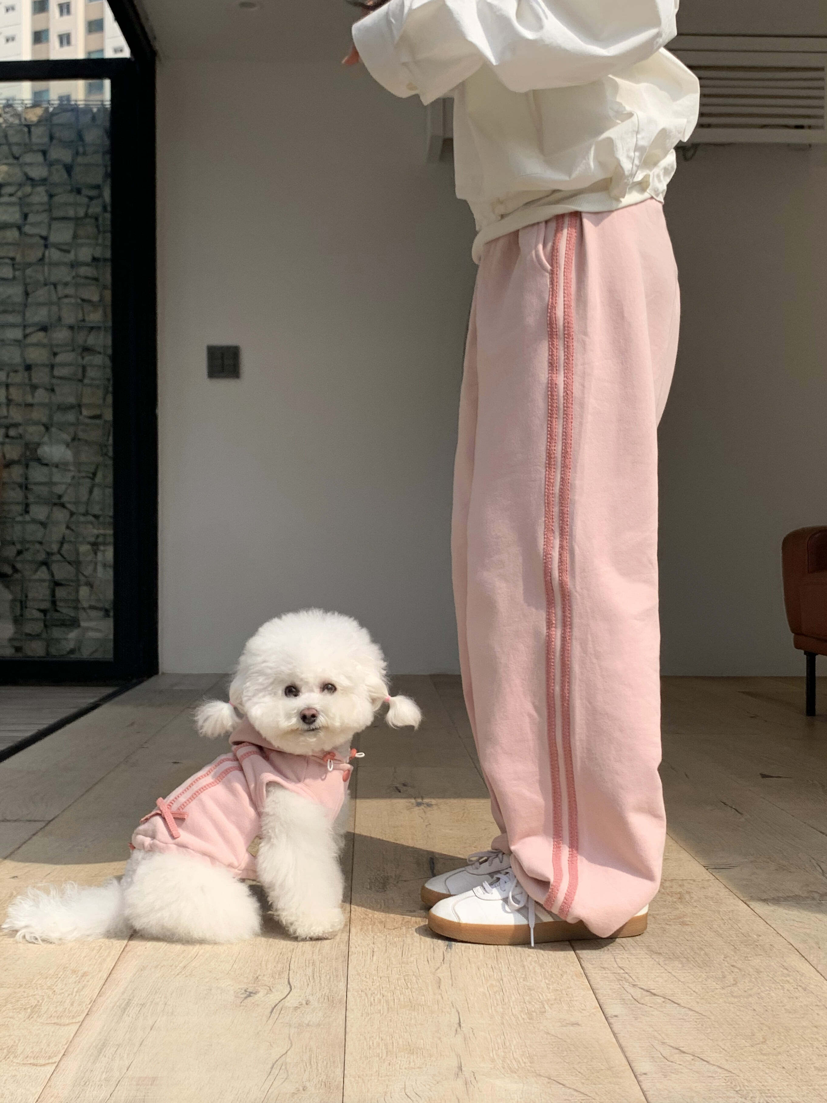 一緒に発売される、飼い主さま用のリボントラックジョガーパンツを合わせて