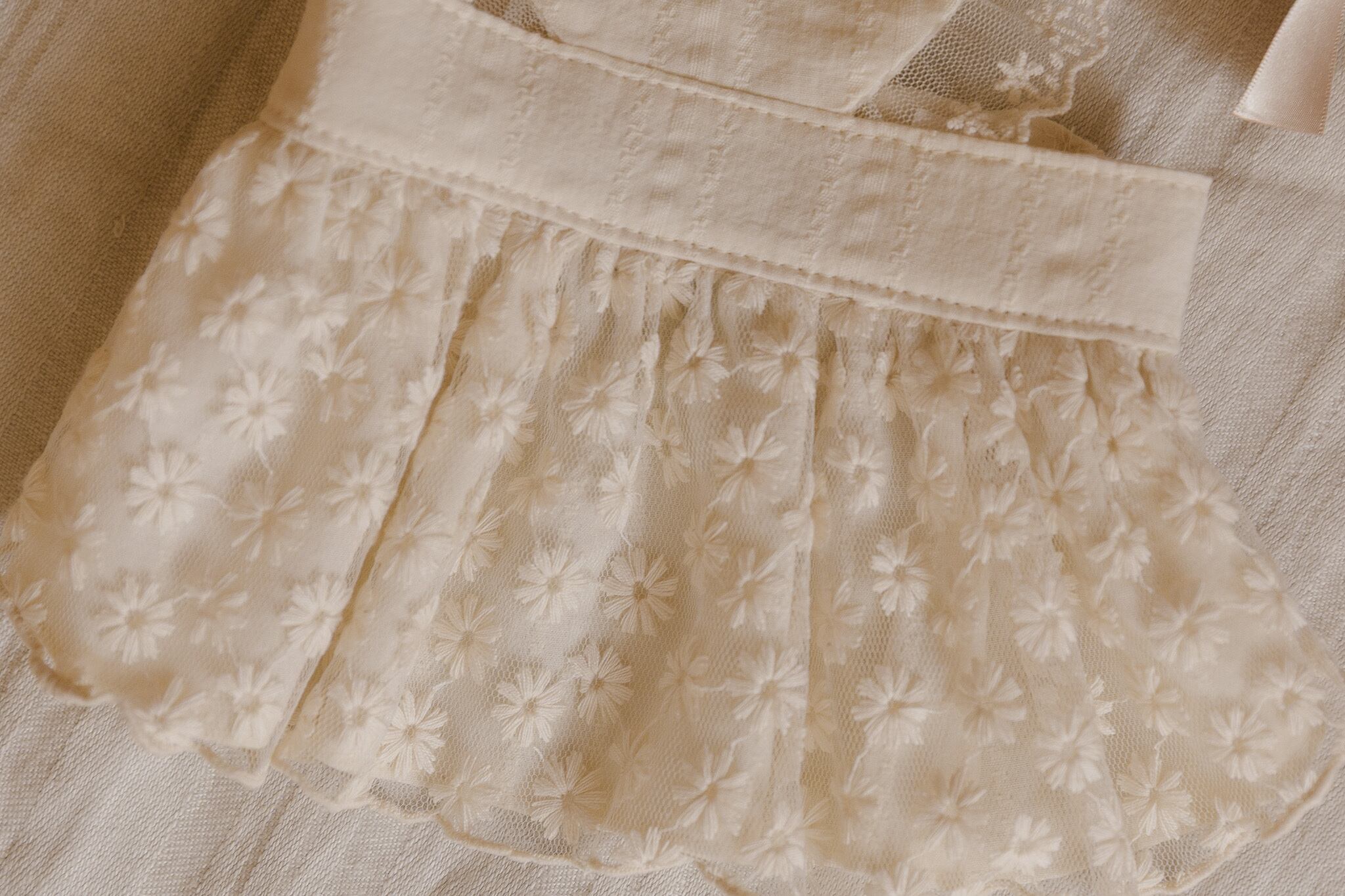柔らかいアイボリーカラーの上に、繊細なデイジーの刺繍が施されたレース素材を加え、